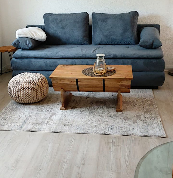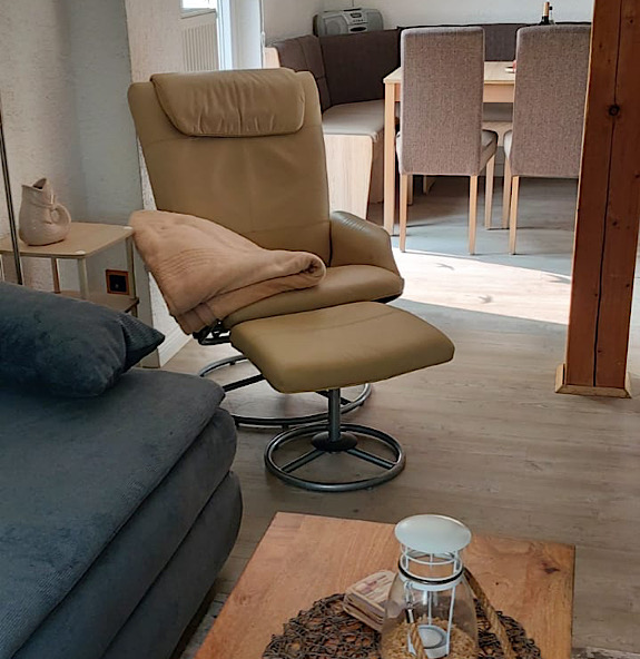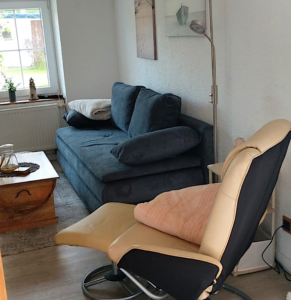 Sitzgruppe (Schlafsofa), Sessel und Kamin, SAT-TV und Radio